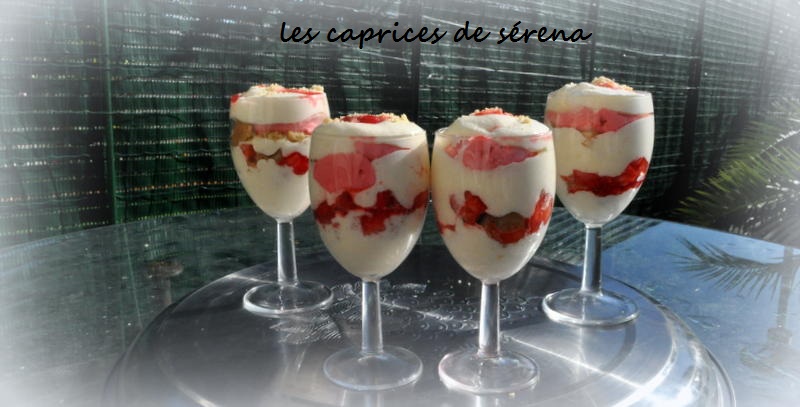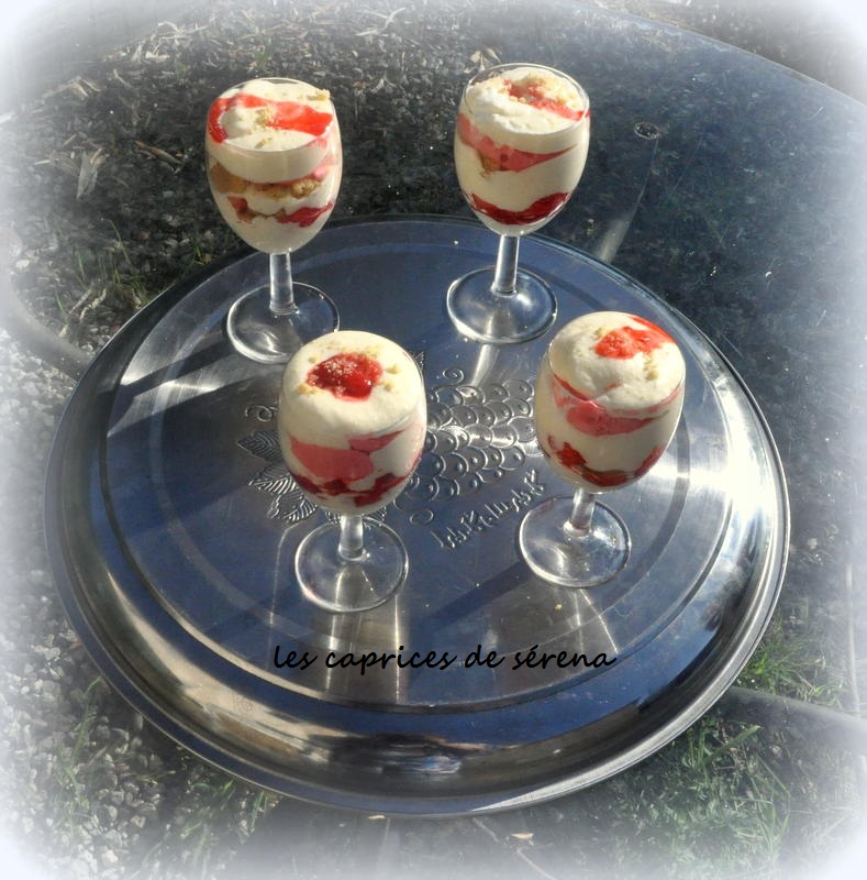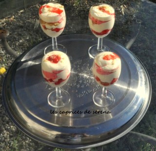 Dans une verrine commencer par une première couche de mousse au mascarpone, puis des canistrelli concassés. On continue avec des fraises fraîches, puis une couche de mousse de fraises, encore quelques morceaux de canistrelli, des fraises, et on finit par une dernière couche de mascarpone. Sur le dessus j’ai rajouter quelques gouttes du jus de fraise.
