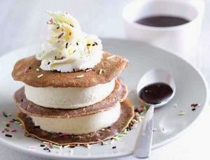 Monter la glace vanille et les crêpes comme un mille-feuille. Décorer de crème Chantilly et ajouter de la sauce au chocolat.