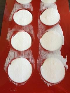 Enfourner pendant 8 mn dans un four préchauffé à 150°.Baisser la température et poursuivre la cuisson (ou plutôt le séchage) à 90° pendant 1h30.laisser refroidir les meringues.Démouler délicatement.