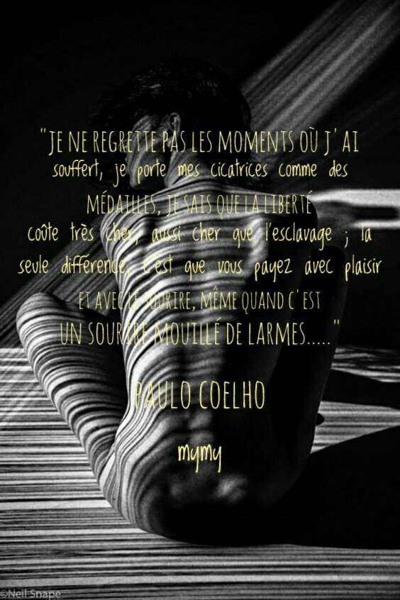 « Je ne regrette pas les moments où j’ai souffert, je porte mes cicatrices comme des médailles, je sais que la liberté coûte très cher, aussi cher que l’esclavage ; la seule différence, c’est que vous payez avec plaisir et avec le sourire, même quand c’est un sourire mouillé de larmes…..