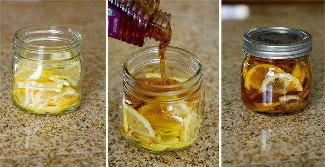verser du thé Dans un bocal… combiner à des tranches de citron, du miel et du gingembre si possible coupé en tranches.